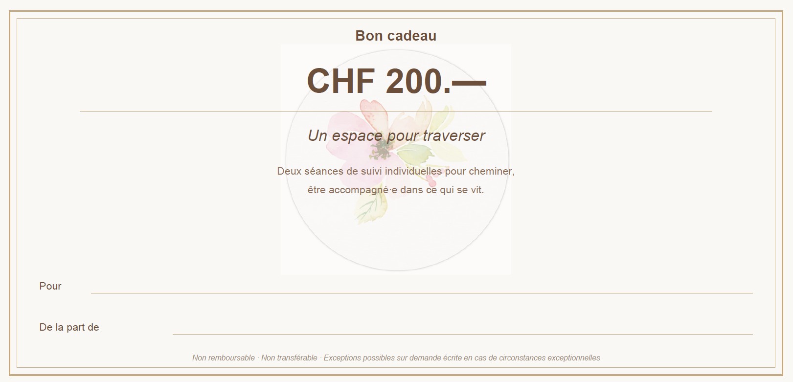 Ce bon cadeau offre deux séances individuelles de suivi (1h en présentiel ou à distance). Des rendez-vous pour continuer à cheminer, être accompagné·e dans ce qui se vit au fil du temps — qu’il s’agisse d’un deuil, d’un proche en fin de vie, ou d’une période qui demande simplement d’être traversée avec soutien.