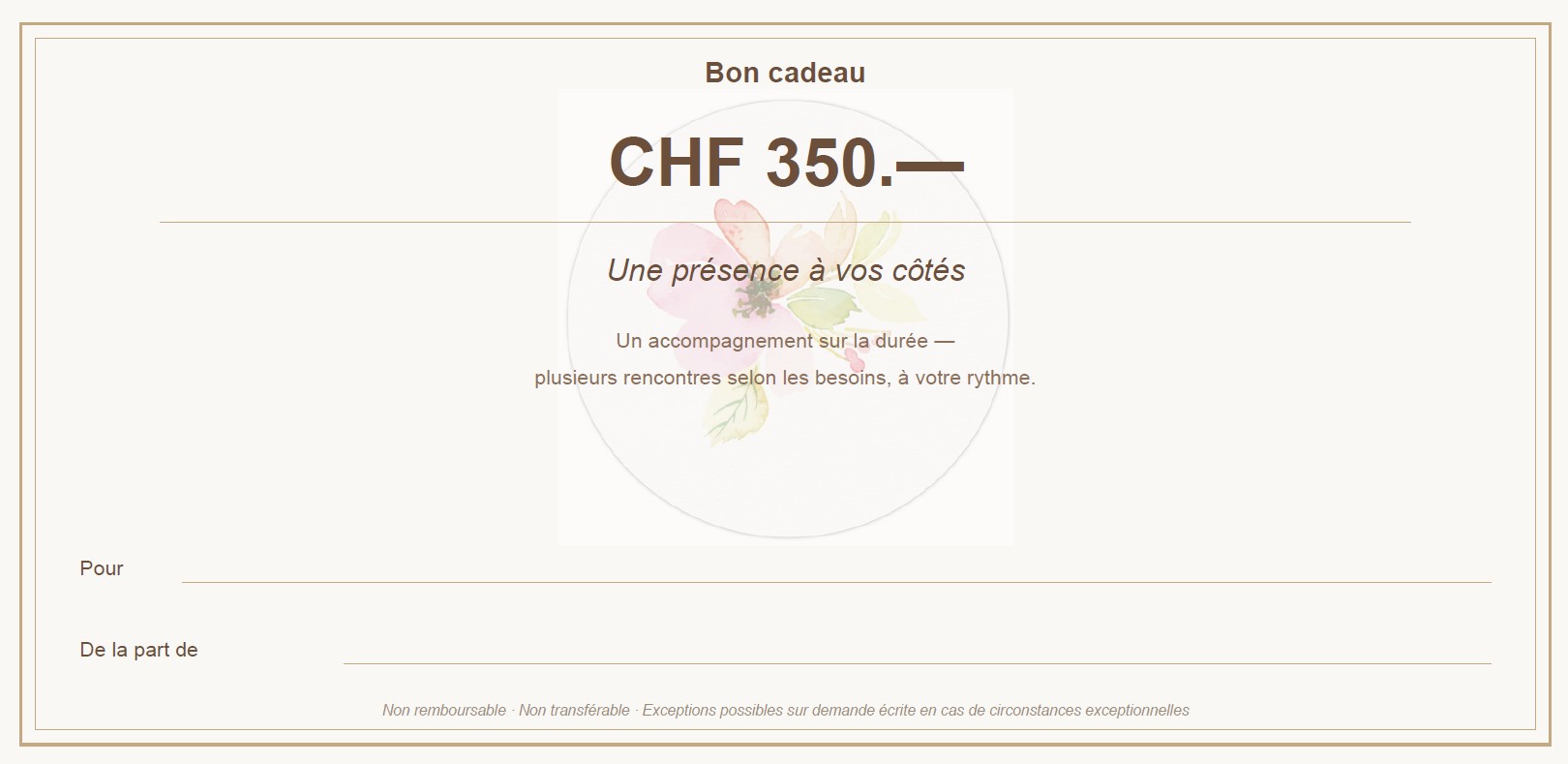 Ce bon cadeau offre plusieurs rencontres individuelles (en général une première rencontre et deux entretien de suivi (en présentiel ou à distance), à utiliser selon les besoins et le rythme de la personne accompagnée. Un soutien souple et personnalisé, conçu pour s’adapter à ce qui se présente — sans cadre rigide, simplement là.